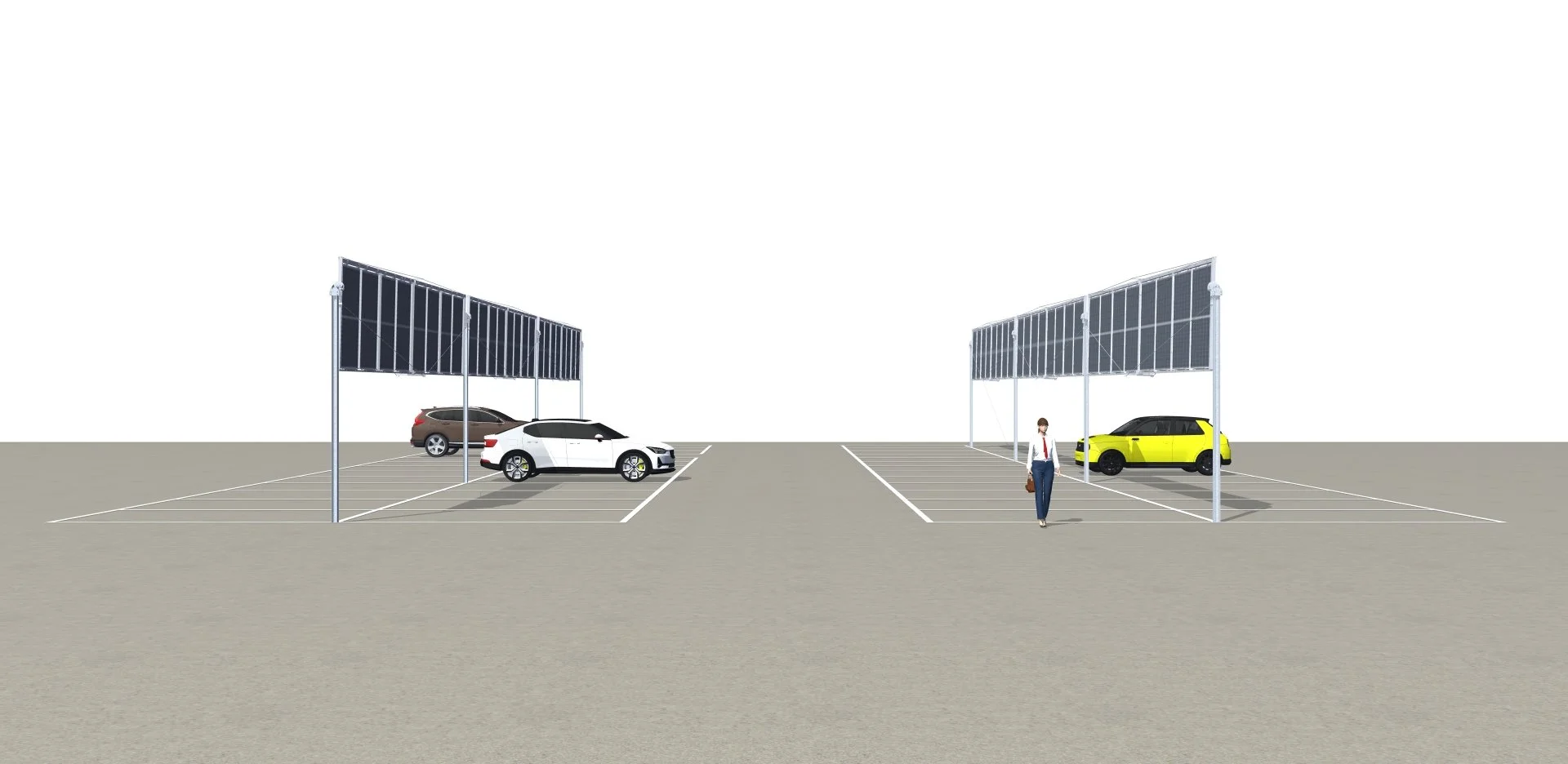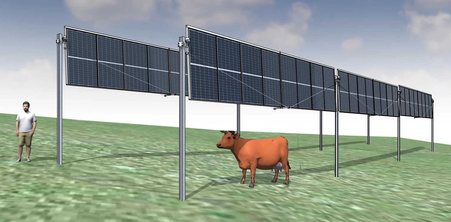 Le démonstrateur agri-PV ci-contre sera réalisé au printemps 2026. La structure est conçue pour être posée au-dessus de cultures (notamment maraîchères), de parkings, de zones de stockages etc. Une étude agronomique sur les effets de l’ombre des panneaux verticaux sur diverses cultures sera menée sur plusieurs saisons.